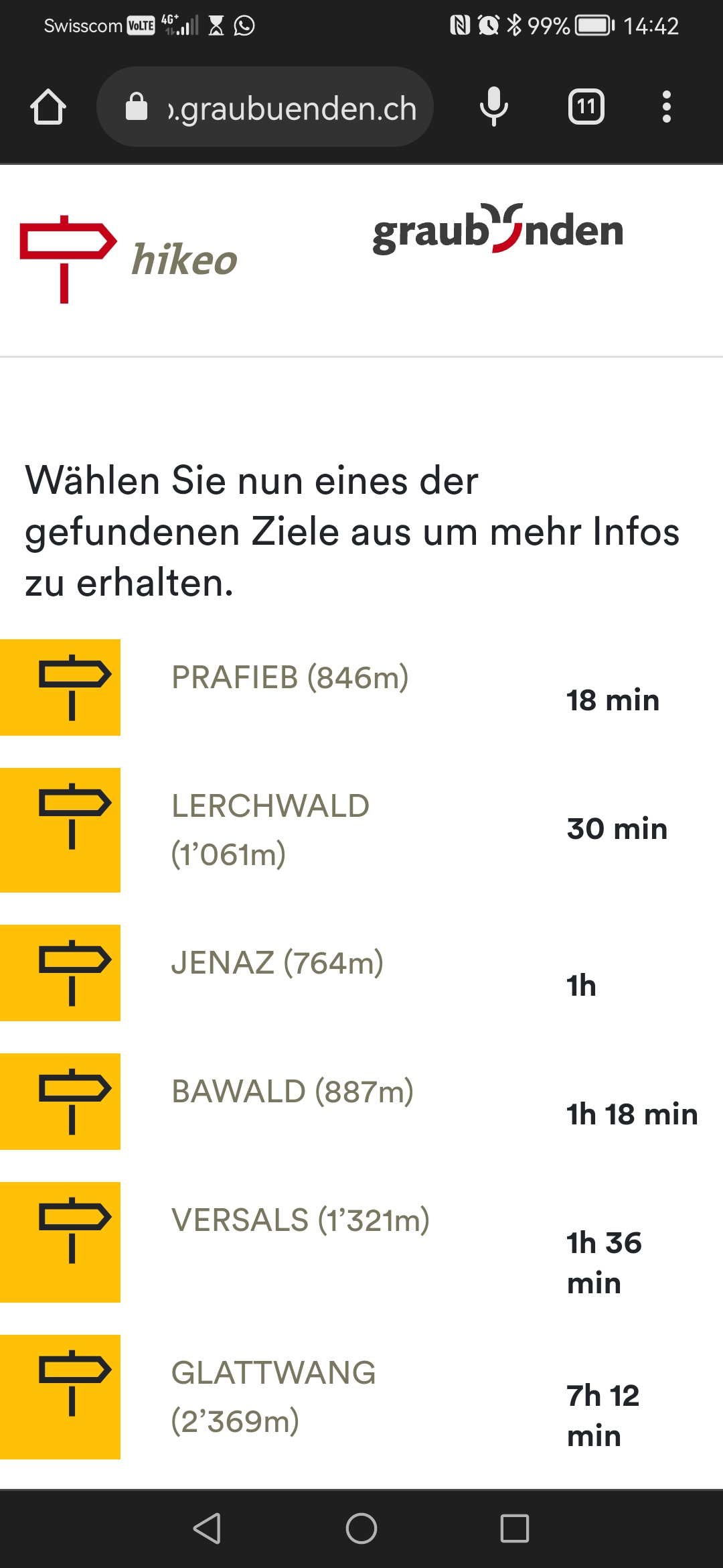 2. Die App schlüsselt Ihnen nun die verschiedenen Wanderziel-Orte auf. Klicken Sie auf das gewünschte Ziel.