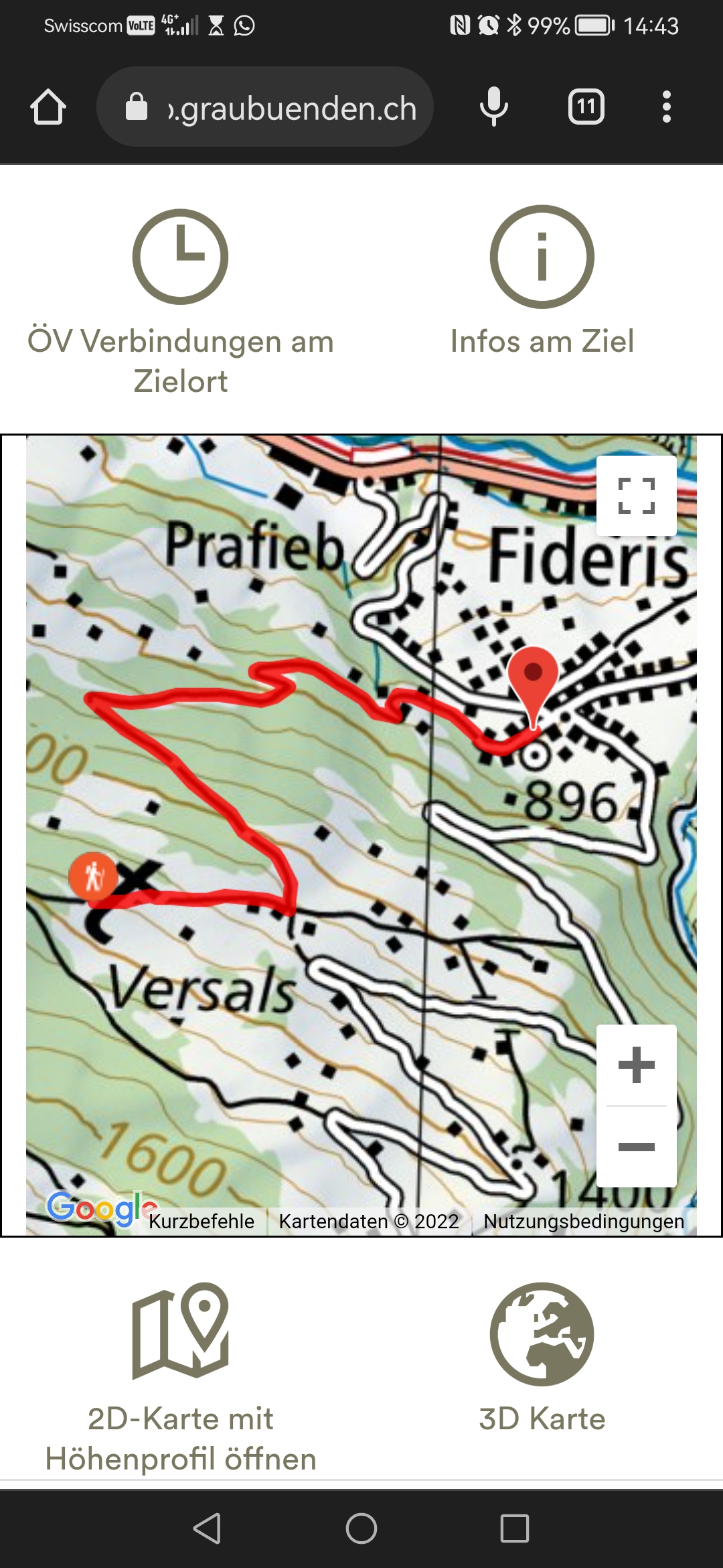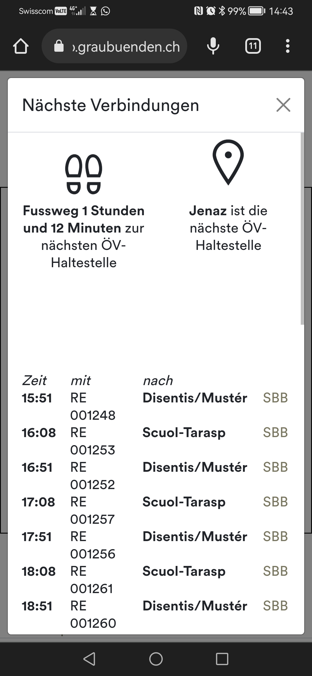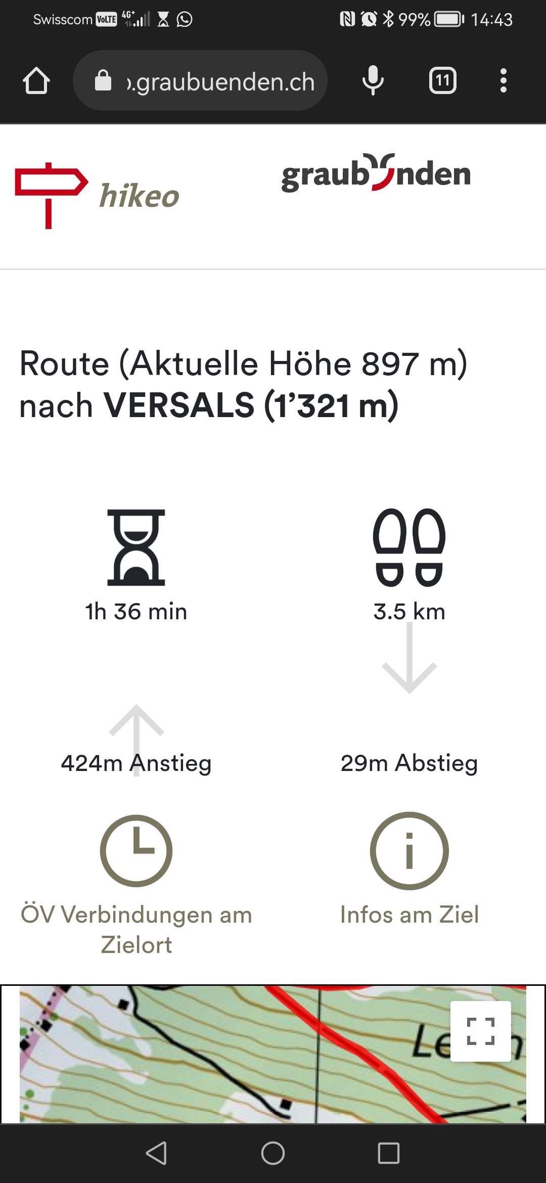 3. Hier sehen Sie, was Sie erwartet: Distanz der Strecke in Zeit und in Km. Wieviel Anstieg und wieviel Abstieg haben Sie zu überwinden? Wann fährt am Zielort der nächste Zug, das nächste Postauto? Und weitere Informationen zum Zielort.
