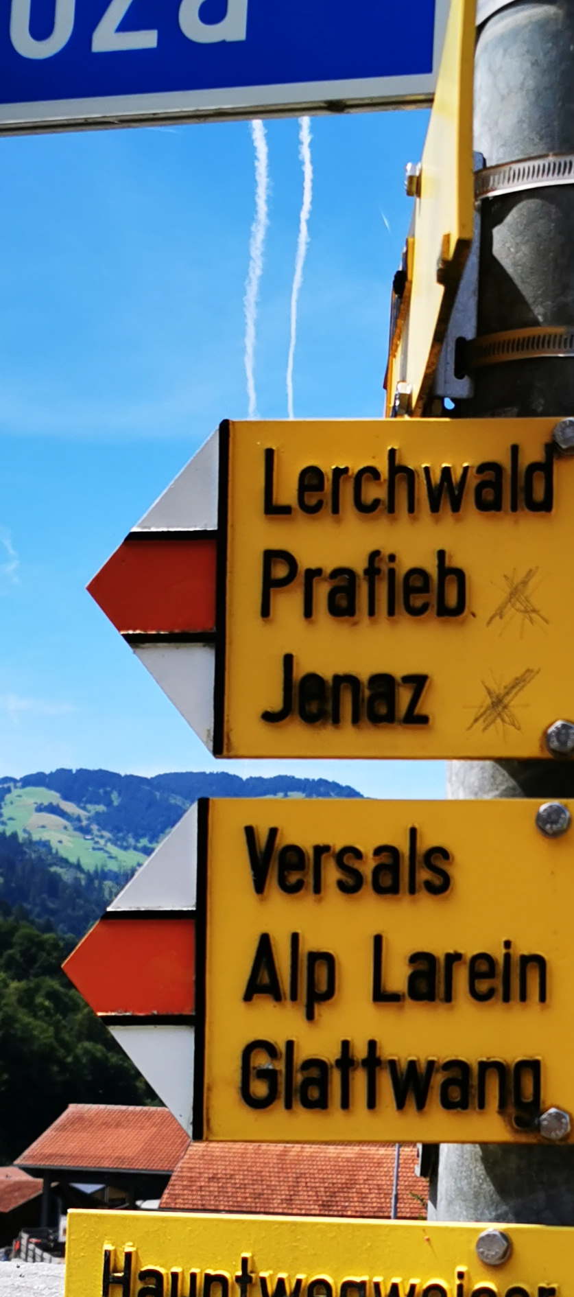 1. Sie treffen einen Wanderwegweiser an. Fotografieren Sie den Wegweiser möglichst von nah bei guter Belichtung ab, indem Sie oben aufs Fotosymbol klicken.